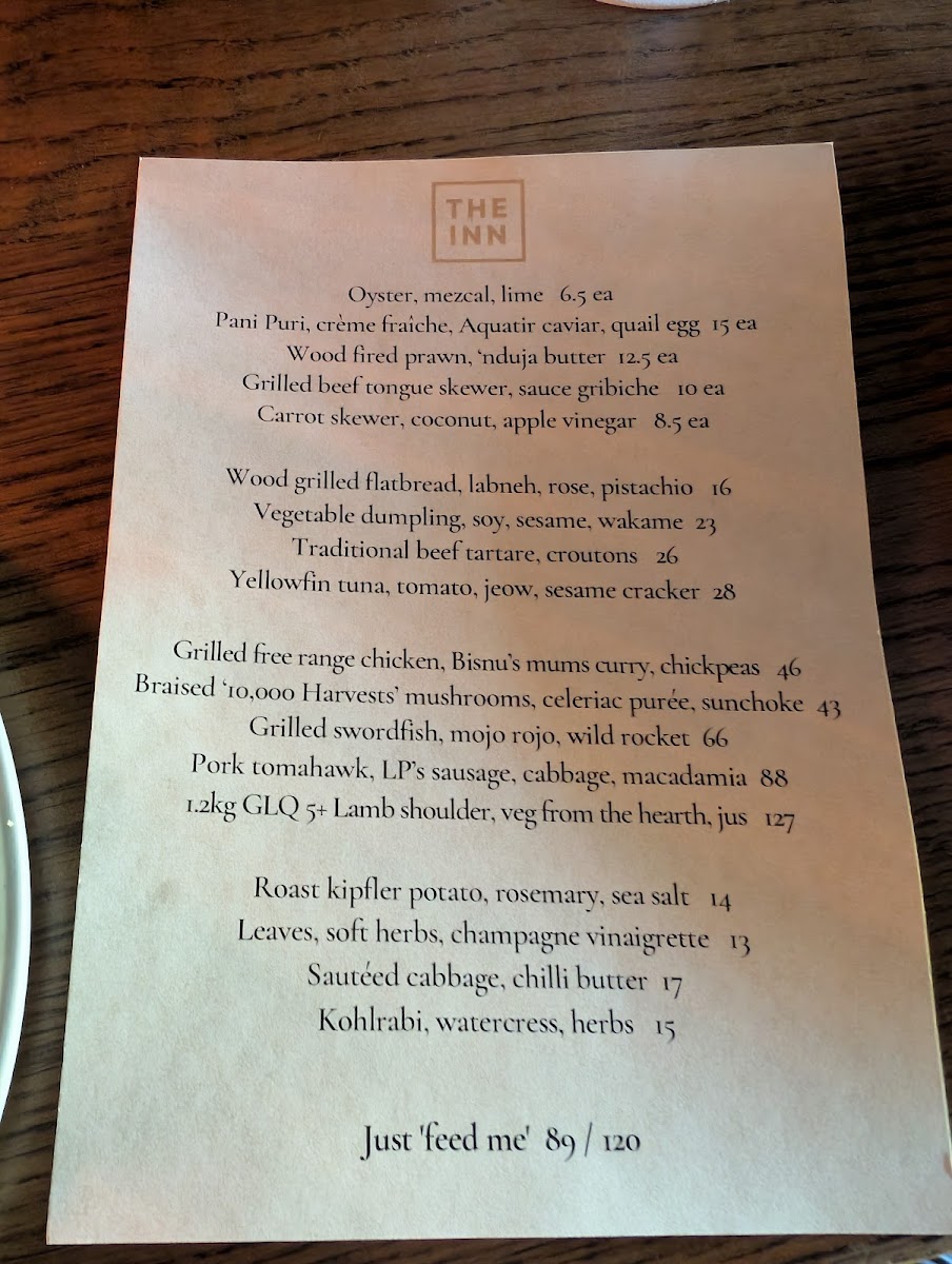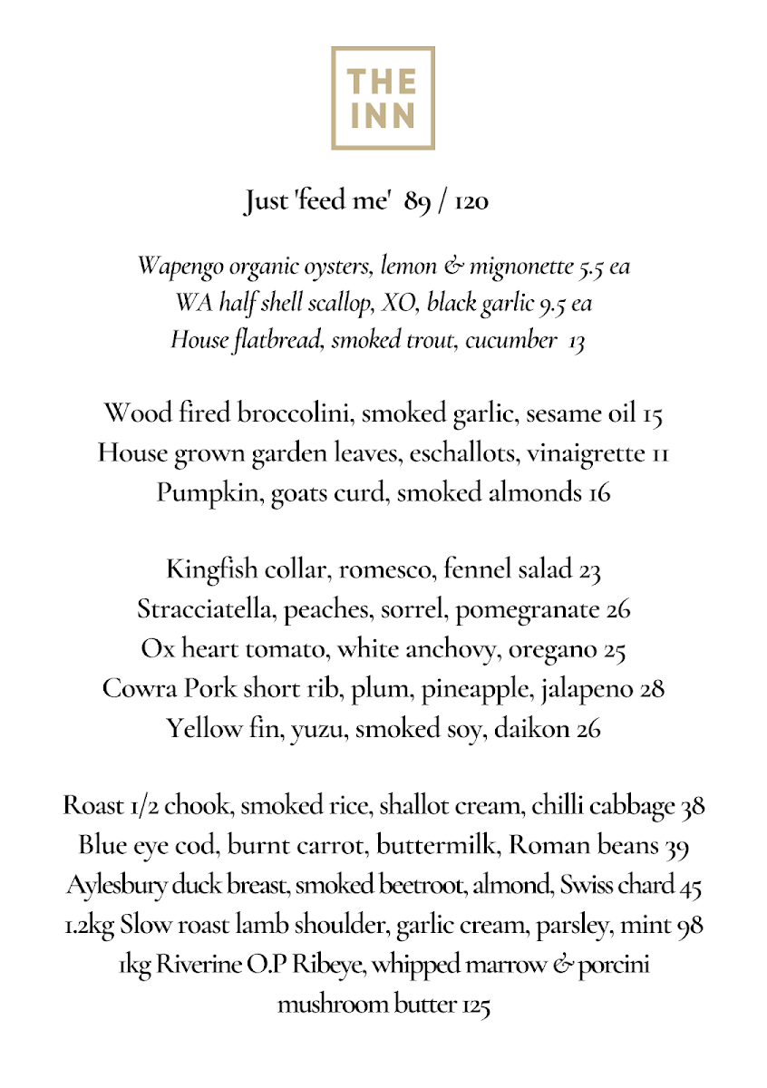 The menu at The Inn offers a delightful array of thoughtfully crafted dishes. The standout offering, Feed Me, showcases an assortment of fresh and flavorful bites, beginning with Wapengo Organic Oysters, served with a zesty Lemon & Mignonette. The Wa Half Shell Scallop comes paired with a rich blend of Xo and Black Garlic, making for a delectable combination. The House Flatbread offers a satisfying accompaniment, perfectly complementing the menu’s lighter items like the Smoked Trout and the refreshing CucumberWood. For those in the mood for something heartier, the Wood Fired Broccolini is paired with a touch of Smoked Garlic and Sesame Oil, elevating the dish with its smoky and savory flavors. A healthy addition to the spread is the House Grown Garden Leaves, dressed with a light Eschallots Vinaigrette, adding a fresh and crisp contrast to the rich tastes. Overall, The Inn offers a well-rounded, flavorful menu that emphasizes fresh, local ingredients, delivering a memorable dining experience.